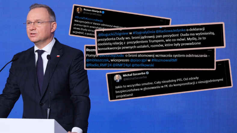 "Katastrofa dyplomatyczna", "błazeńskie gesty i słowa" oraz "kompromitacja" — tak politycy koalicji rządzącej ocenili propozycję Andrzeja Dudy, który wezwał Stany Zjednoczone do rozmieszczenia broni jądrowej na terytorium naszego kraju, a wiceprezydent USA J.D. Vance przyznał, że "byłby zszokowany", gdyby tak się stało. Pozytywnie na plan polskiego prezydenta zareagowali jednak politycy opozycji.