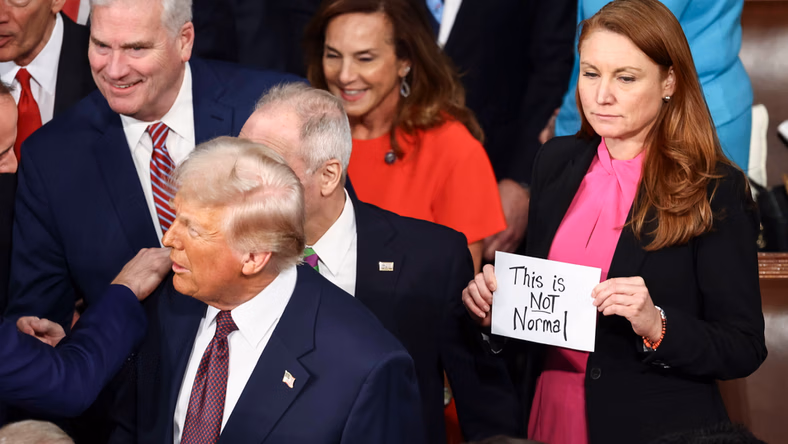 Przedstawicielka Partii Demokratycznej Melanie Stansbury stanęła za Trumpem z kartką z napisem "To nie jest normalne". Kiedy Trump już ją minął, członek Izby Reprezentantów z ramienia Republikanów Lance Gooden wyrwał kartkę i rzucił ją do góry. Zarejestrowały to kamery.